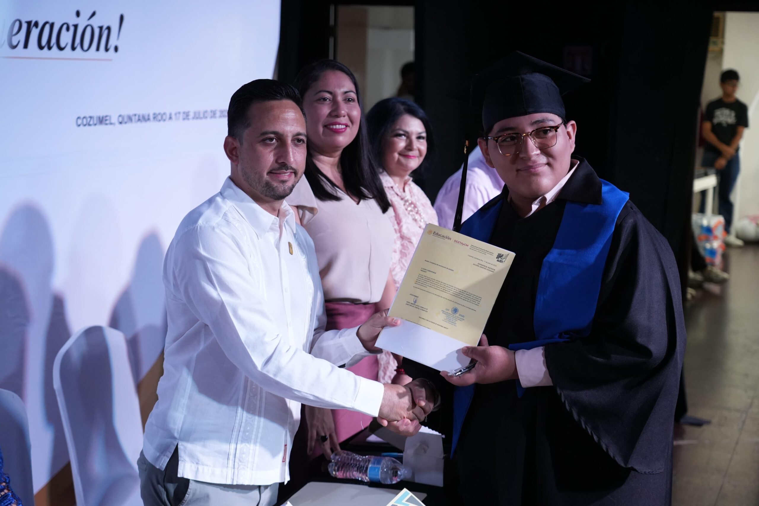 El primer regidor del Ayuntamiento, Lenin Alejandro Mattar Pérez, padrino de las carreras de MPYMES y RRHH, también ofreció un mensaje de aliento: “Quiero decirles que lo que han logrado no es cualquier cosa. Hoy cuentan con un título que les brinda mejores herramientas para enfrentar el futuro, pero también, con una gran responsabilidad hacia ustedes mismos, hacia Cozumel y hacia la sociedad. Tienen todo lo necesario para salir adelante; sigan formándose, luchando y soñando. ¡Felicidades!”