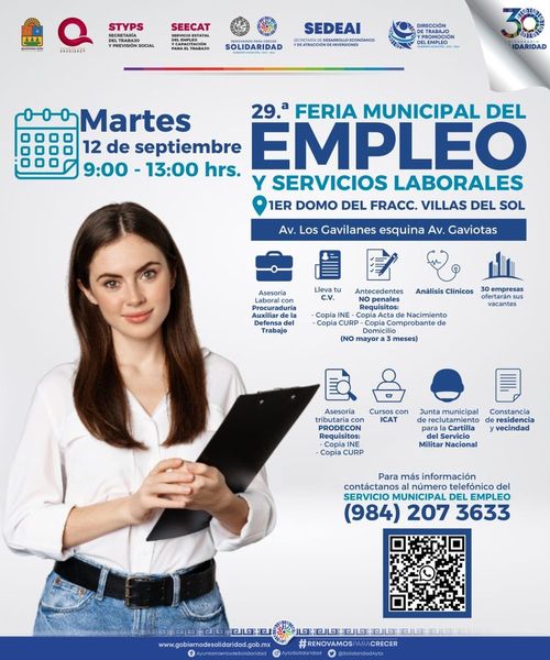 Invita a todas las personas que lo deseen a asistir a esta Feria que estará instalada en el primer parque de Villas del Sol, en avenida los Gavilanes esquina con avenida Gaviotas, a partir de las 9 de la mañana hasta la 1 de la tarde. Recordó a toda la ciudadanía la importancia que asista con currículos, copias de INE y de la CURP.