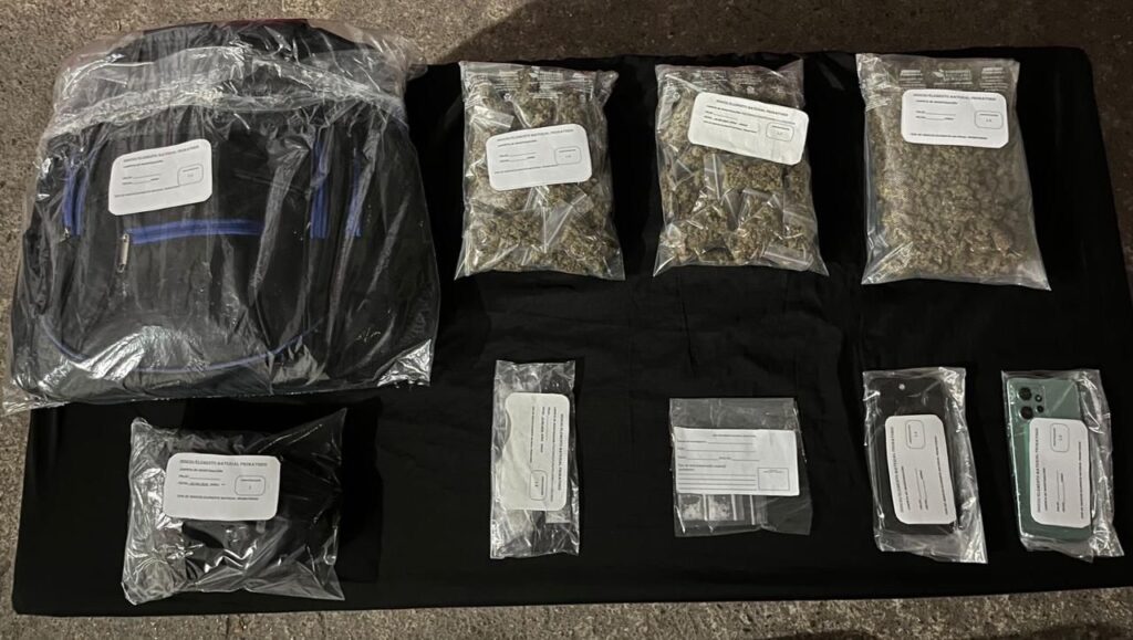 Se les decomisaron: 84 bolsitas de plástico transparente con vegetal verde y seco con las características similares a la marihuana, una bolsa de plástico transparente con vegetal verde y seco con las características similares a la marihuana a granel, 15 bolsitas de plástico transparente con fragmentos sólidos con las características similares al cristal.