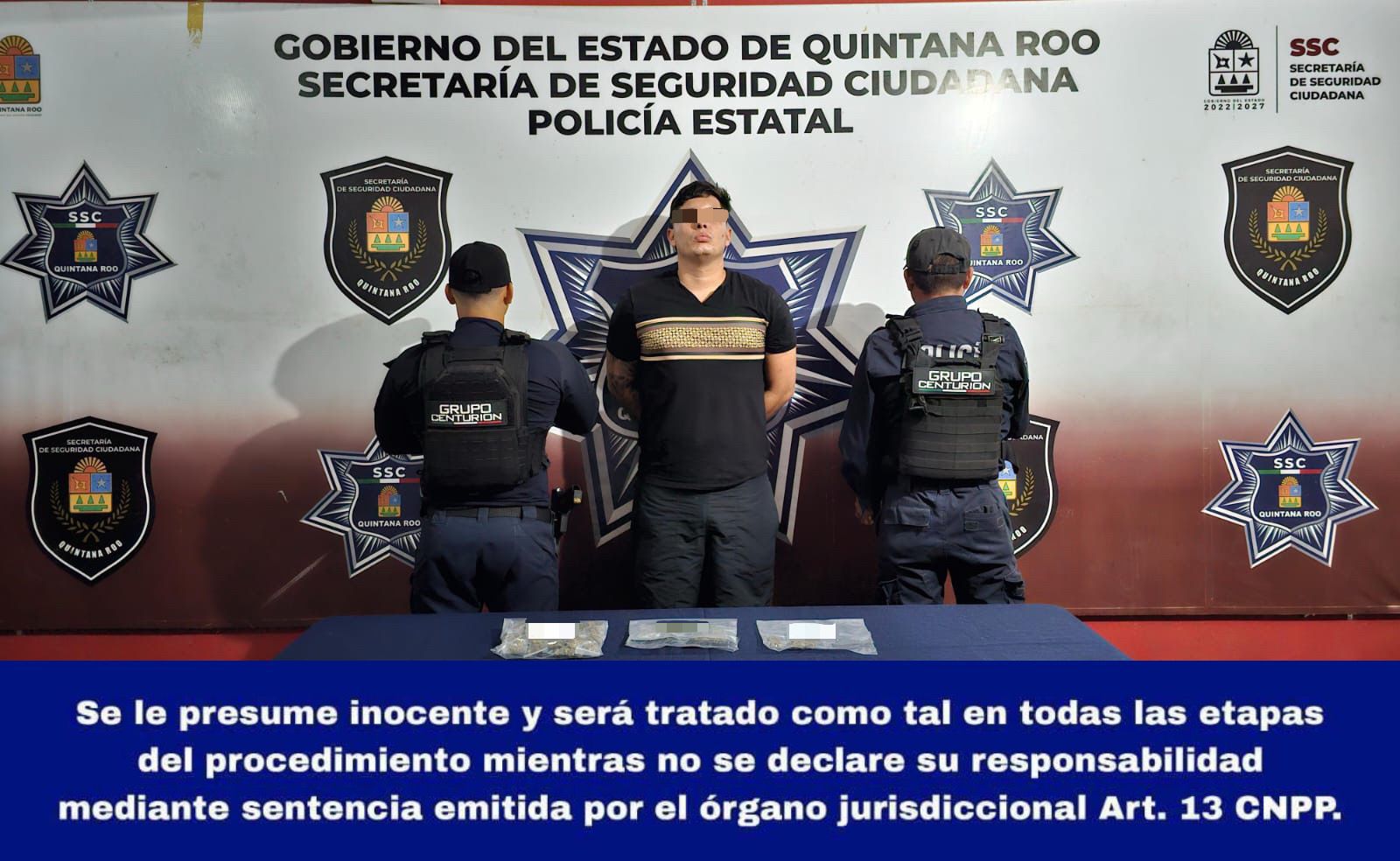 Se le decomisaron: una mariconera, 21 bolsitas de plástico trasparentes tipo ziploc con vegetal de color verde con las características similares a la marihuana, 13 bolsitas de plástico transparente tipo ziploc con fragmentos sólidos cristalinos con las caracteristicas similares al cristal, un telefono celular y el vehículo Mazda 3 de color rojo, con placas de circulación de Quintana Roo.
