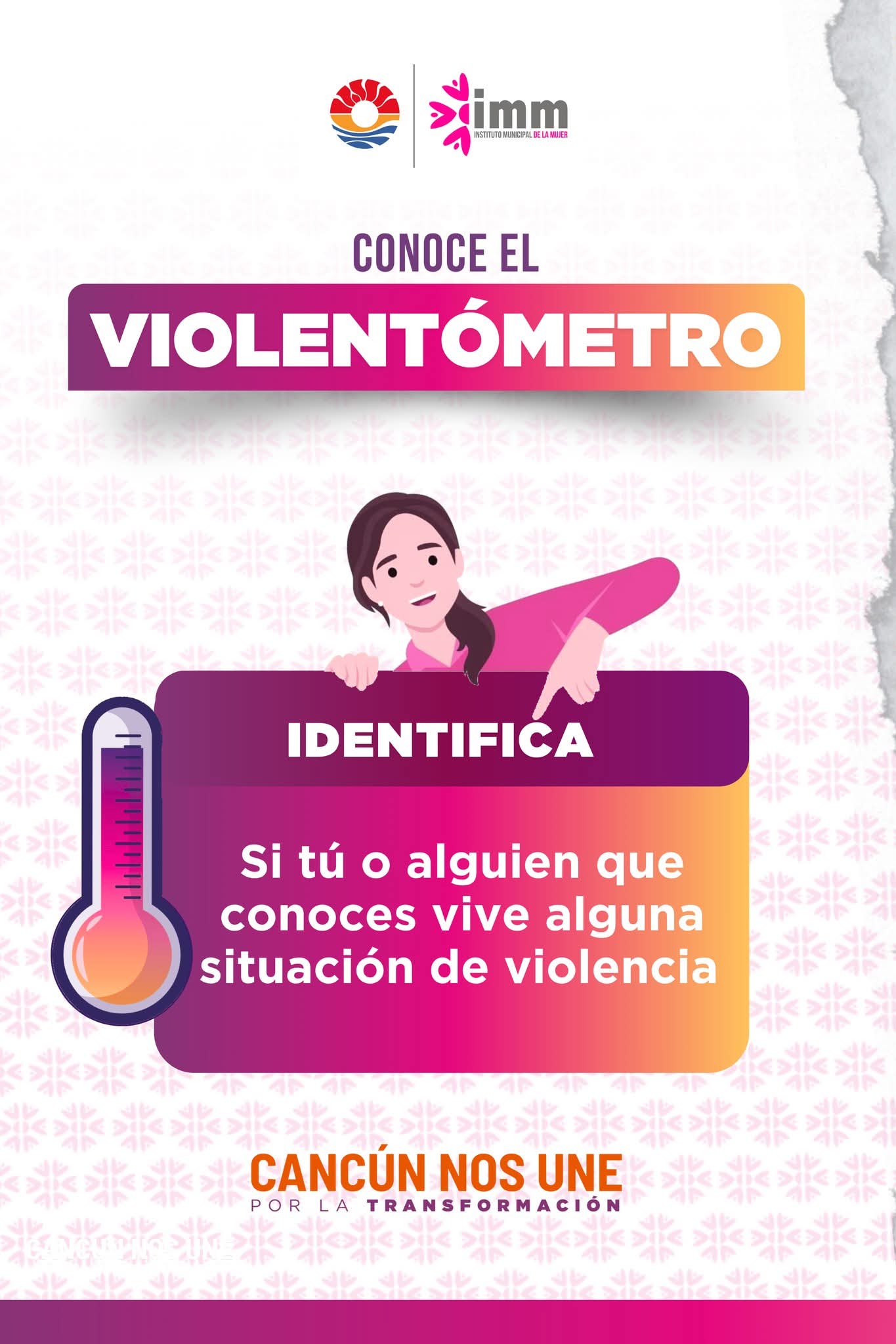 Cancún, Q. R., a 25 de octubre de 2025.- En el marco del Día Naranja, y con el objetivo de visualizar el grado de las diferentes manifestaciones de violencia ocultas en la vida cotidiana y que muchas veces se confunden o son desconocidas por las personas violentadas, las autoridades del Ayuntamiento de Benito Juárez, a través del Instituto Municipal de la Mujer (IMM), reitera los tipos de violencia que puede sufrir una mujer mediante el “Violentómetro”.