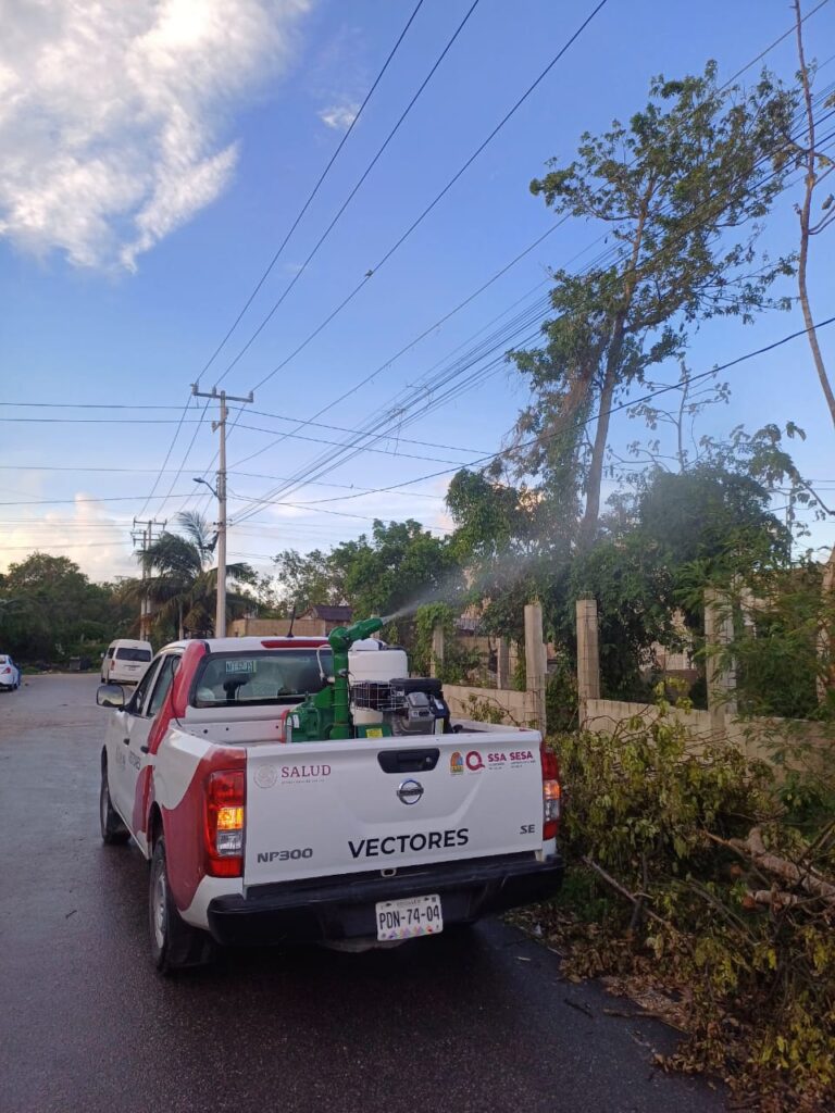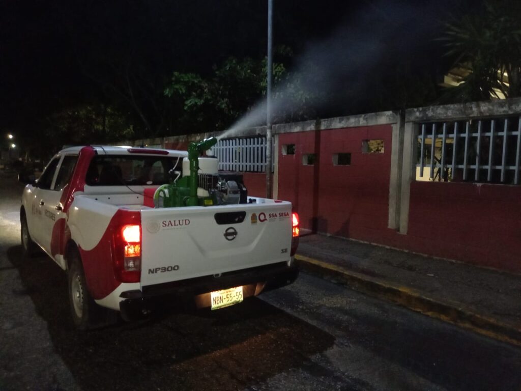 Chetumal.- Personal de vectores de la Secretaría de Salud (SESA) de Quintana Roo ha nebulizado aproximadamente 128 mil 765 hectáreas con máquinas pesadas ULV instaladas en camionetas, máquinas térmicas, motomochilas y bombas aspersoras para evitar la proliferación de moscos transmisores del dengue.