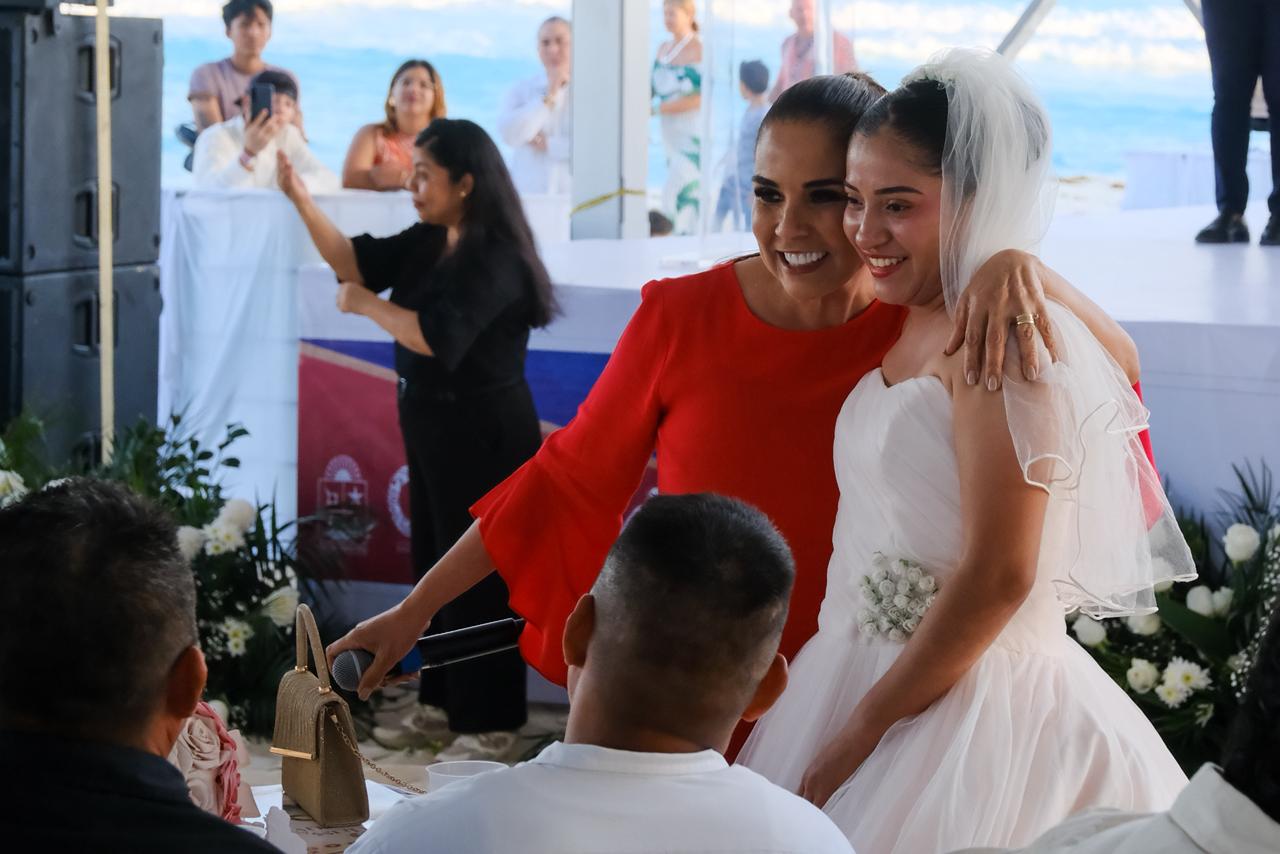 En el mensaje que dirigió a las y los contrayentes, la gobernadora Mara Lezama recordó que cuando fue presidenta municipal de Benito Juárez decidió que las bodas colectivas se hicieran en la playa, frente al mar, pues las playas son de todos y no de unos cuantos.