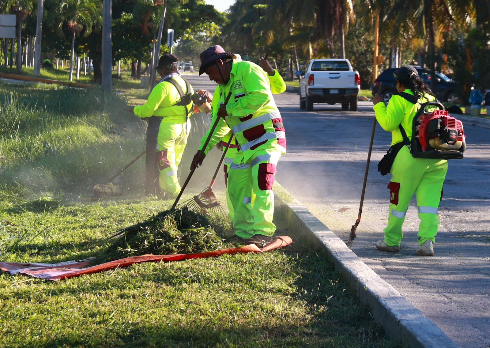 Los trabajos se efectuaron entre la Av. Sayil y la Av. Uxmal, en un tramo de cuatro kilómetros, donde más de 20 elementos llevaron a cabo la limpieza general en las calles y avenidas con barrido fino, pepena, limpieza de guarniciones y banquetas, poda de árboles, así como retiro de basura vegetal y orgánica.