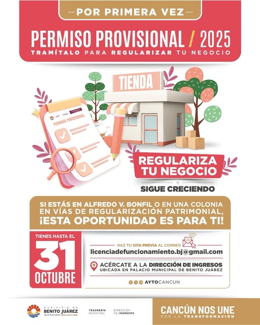 Cancún, Q. R., a 27 de octubre de 2025.- El Ayuntamiento de Benito Juárez, a través de la dirección de Ingresos, invita a los ciudadanos de la delegación de Alfredo V. Bonfil o en colonias en vías de regularización patrimonial a aprovechar los últimos días para tramitar el permiso provisional 2025 por primera vez, hasta el próximo viernes 31 de octubre.
