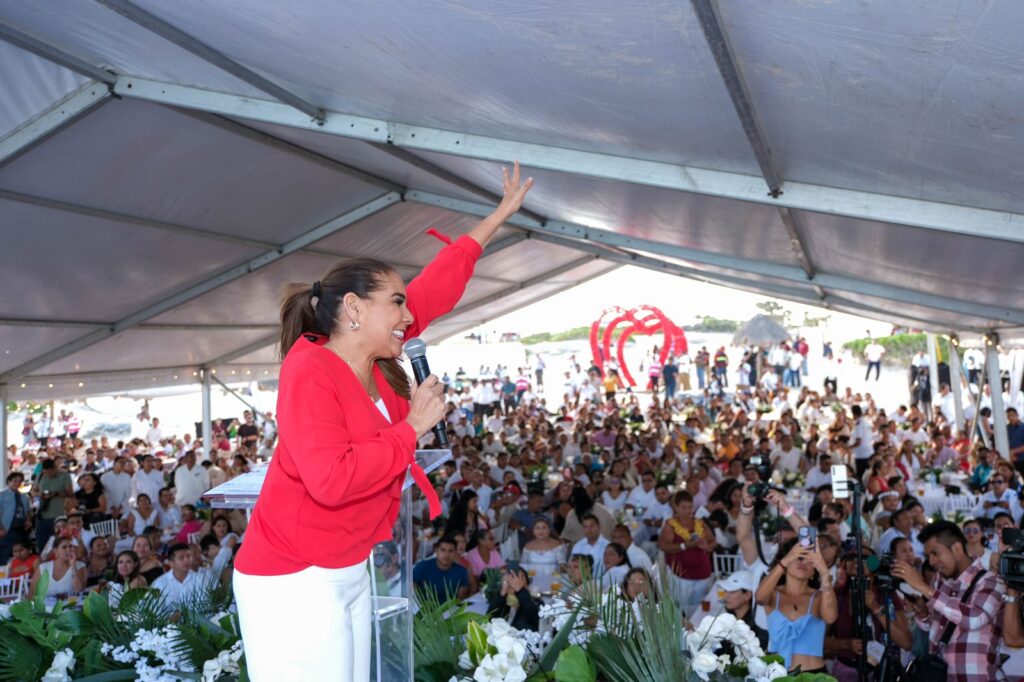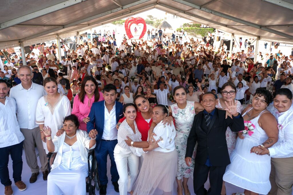 Cancún.- Un total de 350 parejas de Benito Juárez que formalizaron su unión a través de las Bodas Colectivas 2024, en el marco del Día del Amor y la Amistad, tuvieron como testigos de honor a la gobernadora Mara Lezama Espinosa, la presidenta del Sistema DIF Quintana Roo Verónica Lezama Espinosa y la presidenta municipal Ana Paty Peralta de la Peña.