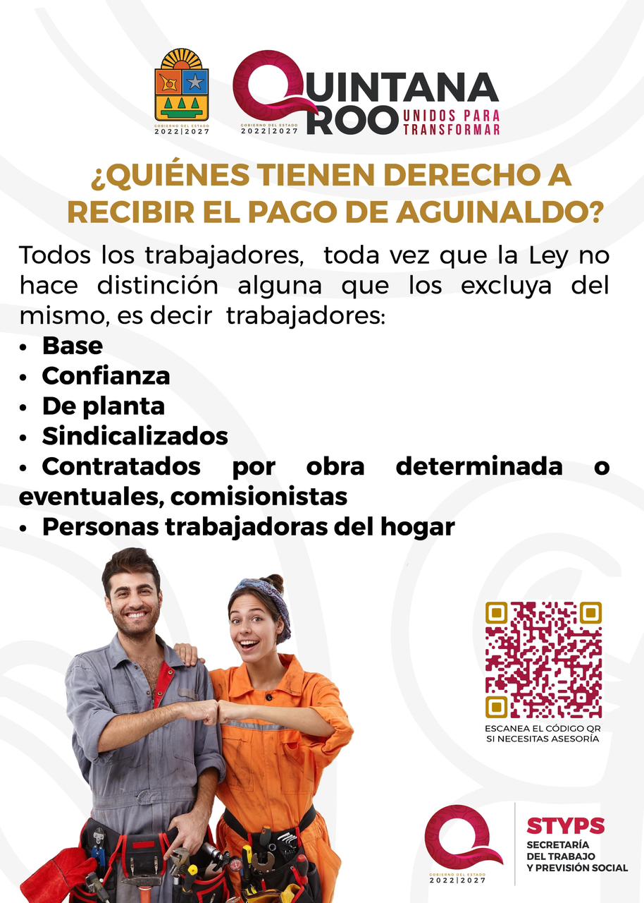 Chetumal.- La Secretaría del Trabajo y Previsión Social (STyPS) en cumplimiento de las políticas de justicia laboral impulsadas por el gobierno de humanista que encabeza la gobernadora Mara Lezama Espinosa, informó a que durante el presente mes de diciembre se puso en marcha el Operativo de Vigilancia del Pago de Aguinaldo 2025, a partir del 20 de diciembre en todo el estado, informó la encargada del despacho de la STyPS Verónica Salinas Mozo.